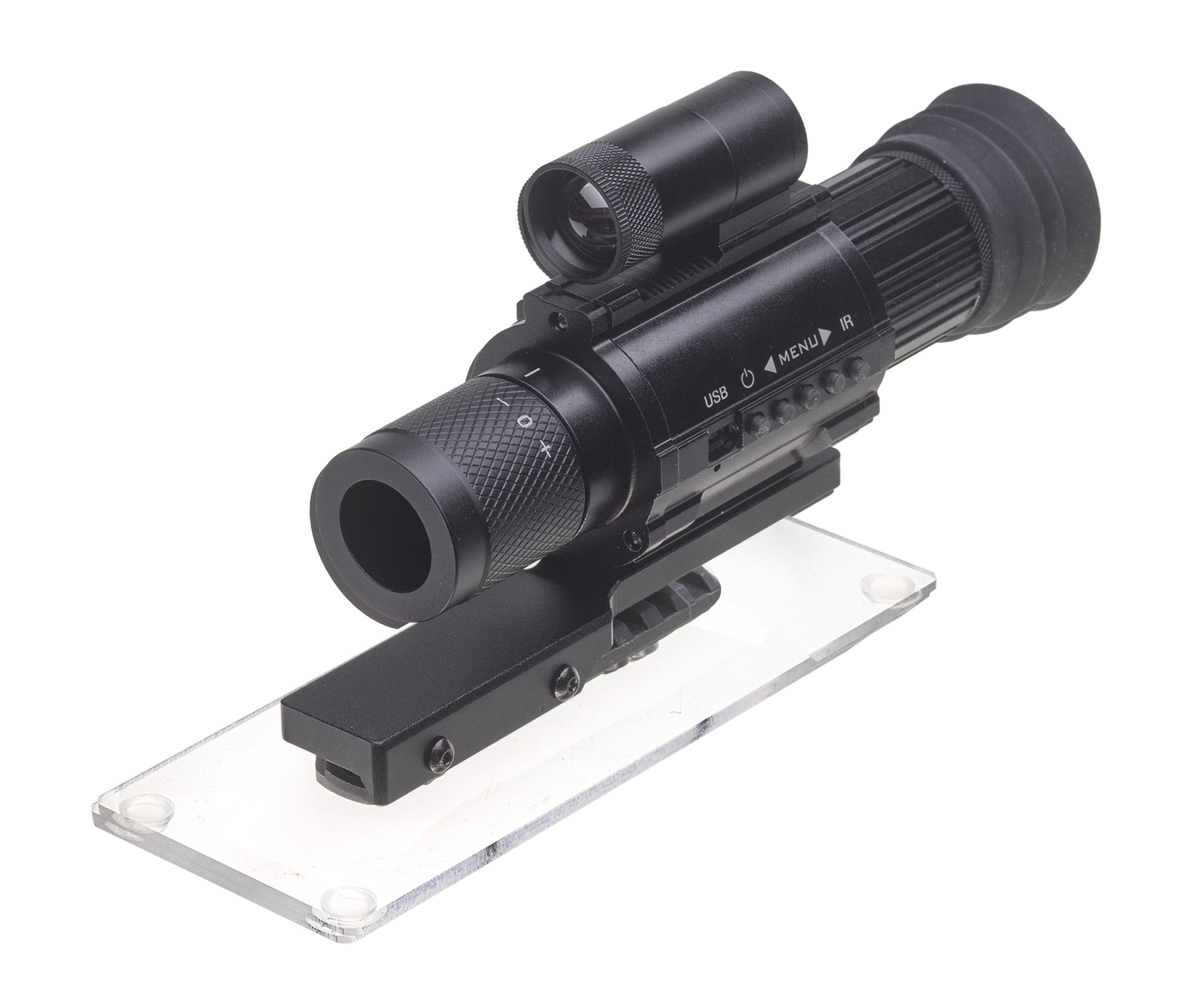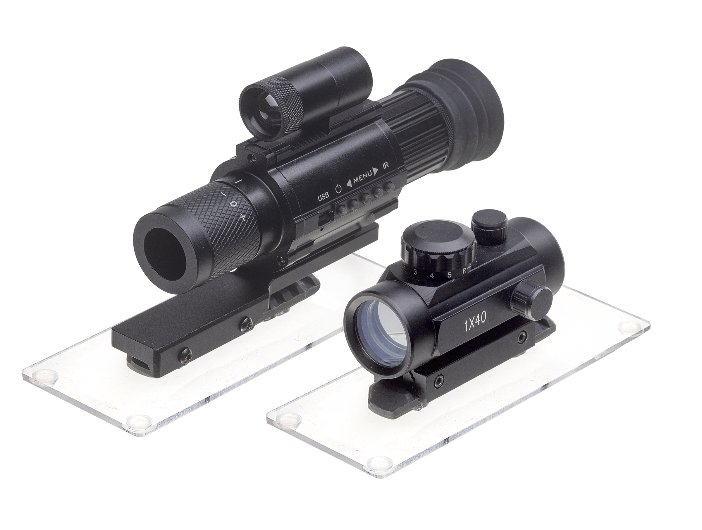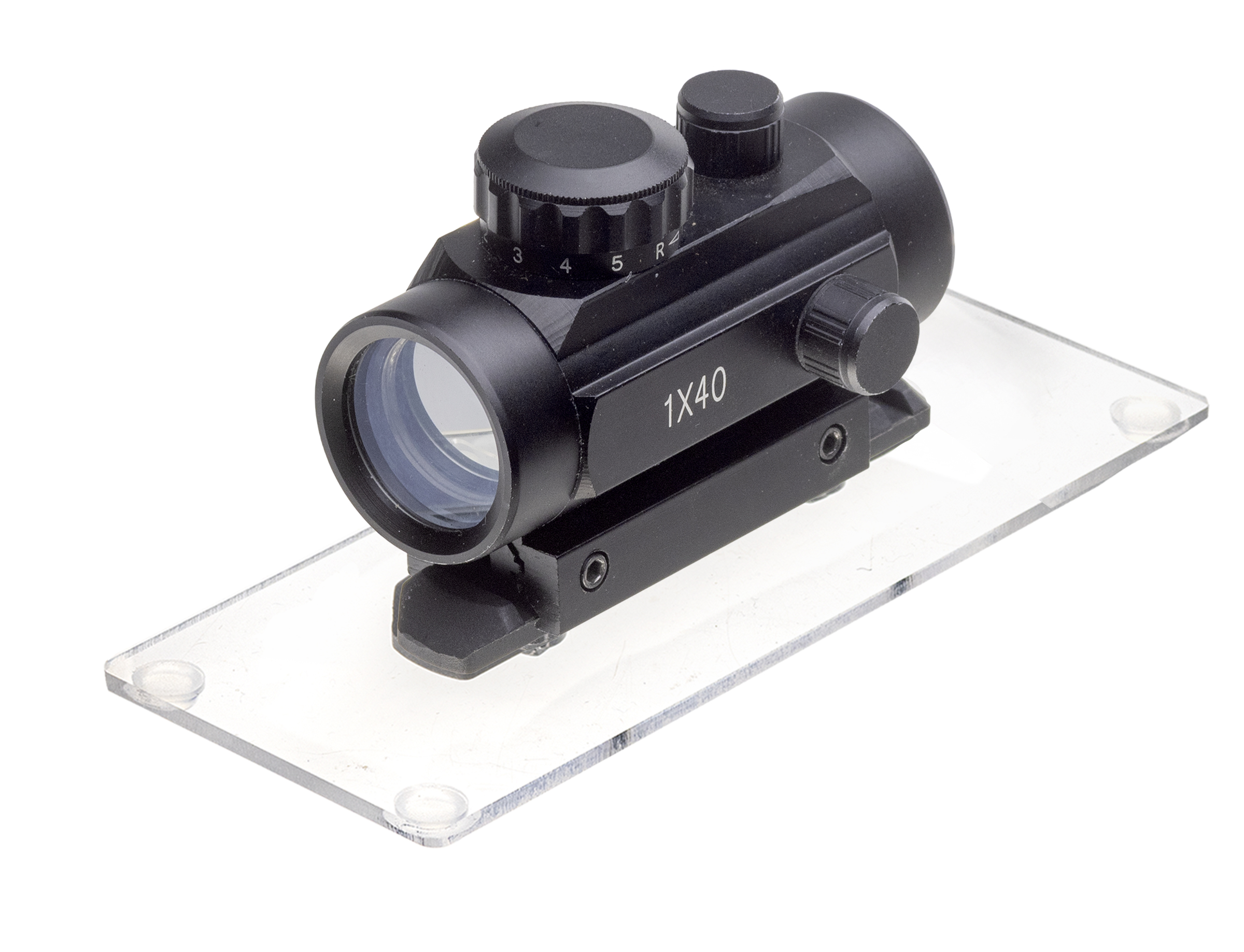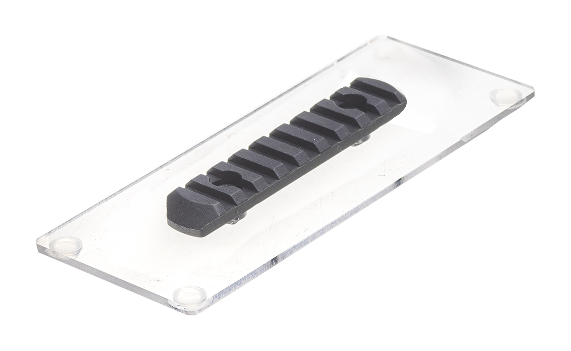 Acrylic display with 1 Picatinny rail for mounting scopes.